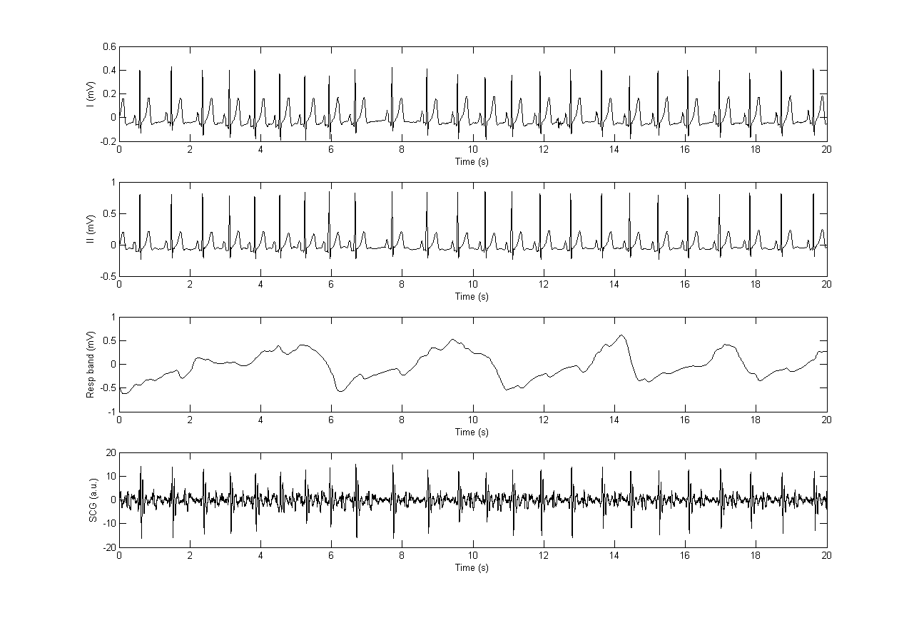 Data was acquired using a Biopac MP36 data acquisition system (Santa Barbara, CA, USA). Channels 1 and 2 of the system were devoted to measure conventional ECG (leads I and II respectively) with a bandwidth between 0.05 Hz and 150 Hz, channel 3 was employed to measure the respiratory signal obtained from a thoracic piezoresistive band (SS5LB sensor by Biopac, Santa Barbara, CA, USA) with a bandwidth of 0.05 Hz to 10 Hzand channel 4 was devoted to acquire the SCG using a triaxial accelerometer (LIS344ALH, ST Microelectronics) and a bandwidth between 0.5 Hz and 100 Hz. For the ECG measurement we used monitoring electrodes with foam tape and sticky gel (3M Red Dot 2560). Each channel was sampled at 5 kHz.